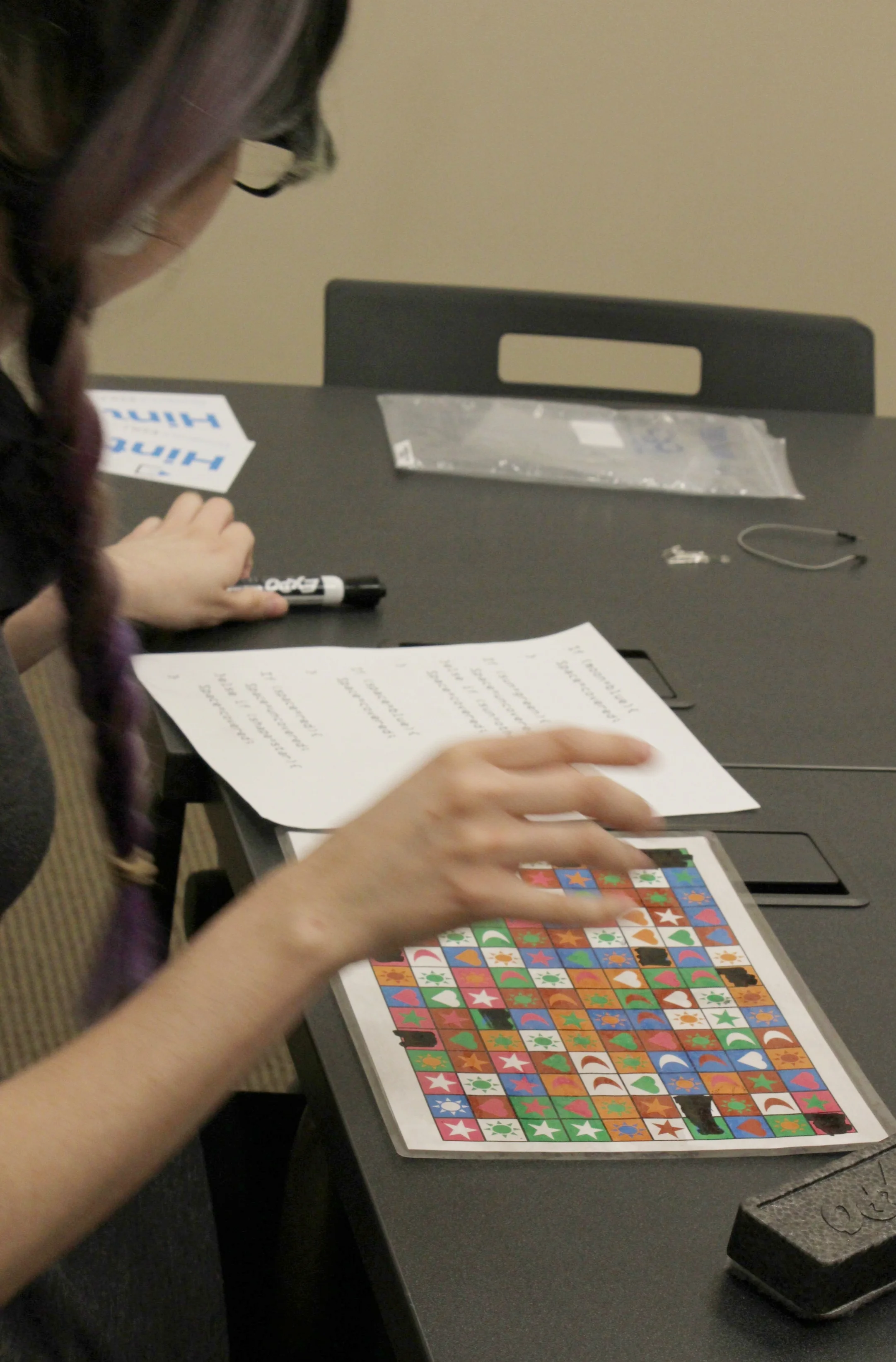 Players assign directions they find in the room to specific shapes. When the Robot Token is on a shape then it will follow the command that’s been assigned to that shape. Players needs to get the robot to the end of the maze. The order of the directions is the answer to the puzzle.